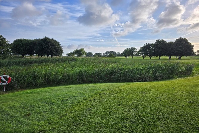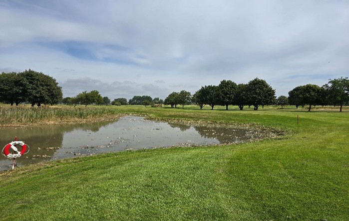 Under ett par veckor har vi haft en robotklippare rullandes på banan och vi kommer att utvärdera detta under höst/vinter för att se om det kan vara något att investera i. Vi eller rättare sagt jag tog ett beslut att lägga igen en greenbunker på gul hål 8 då det rann vatten i denna och att det ej fanns någon dränering i denna. Om vi vill ha en bunker där i framtiden så kommer vi ta in en entreprenör som kan göra detta på bästa vis. Vi har även haft en vassklippare på besök som klippte ner lite vass. Detta blev ett fantastiskt resultat och vi tittar på att få fler dammar rensade. Gul hål 6.