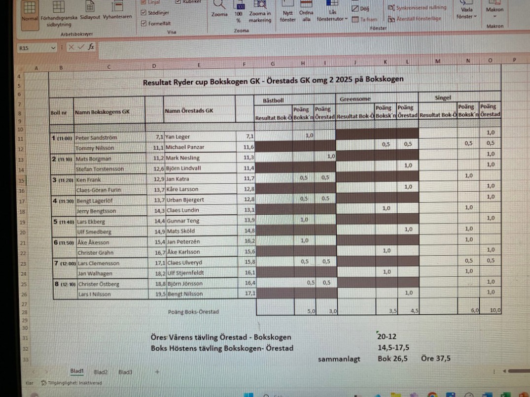Den 17e oktober spelade vi den andra delen av vår Ryder cup tävling mot Bokskogen. Vädergudarna var med oss och det blev en vindstilla dag med 20 grader och sol. Med en boll kvar ledde Bokskogen med 1 poäng men tack vara att vår sista par (Arne Sandberg och Ulf Stjernfeldt) tog alla 4 poäng vann Örestad med 3 poäng. I och med att vårens omgång på Örestad blev oavgjord tog Örestad hem bucklan för första gången. Tack till alla som deltog.